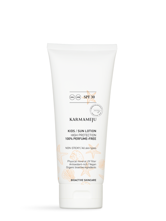 KIDS SUN LOTION SPF 30 er dermatologisk testet til sensitiv hud og 100% parfumefri UV-beskyttelse til børn og alle, der ønsker at bruge solcreme uden duft.