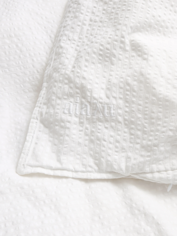 Sengetøj i blødt, økologisk bæk- og bølgebomuld, der giver en crisp, frisk overflade. Detaljeret med et diskret, broderet aiayu-logo og stukkede kanter. Sættet inkluderer ét hovedpudebetræk med kuvertlukning og én dyne med lynlåslukning.