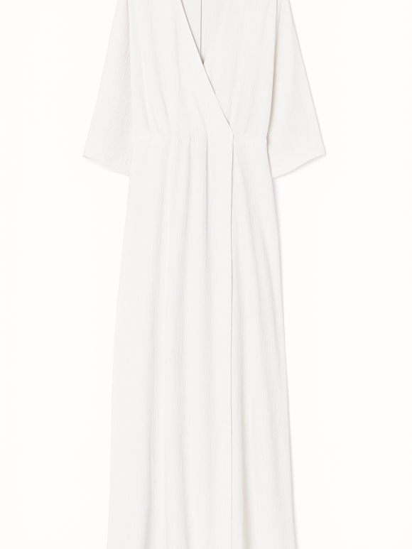The fluid and slightly crisp texture of the cotton and silk fabric complements the skirt's light lines, accentuated by pleats that create an appealing play of volumes.