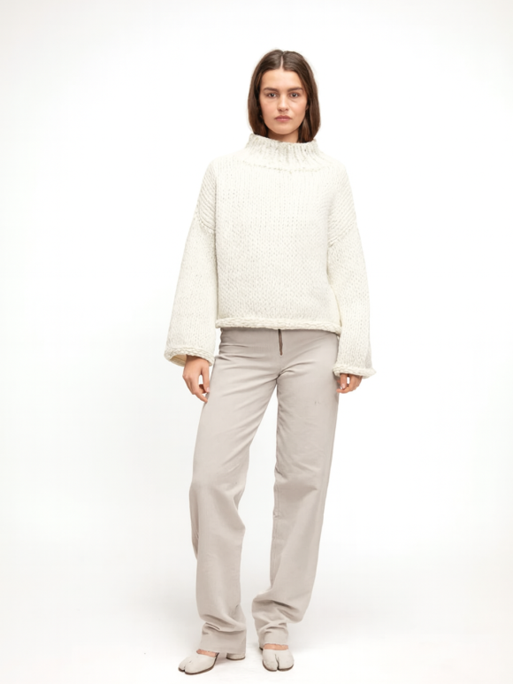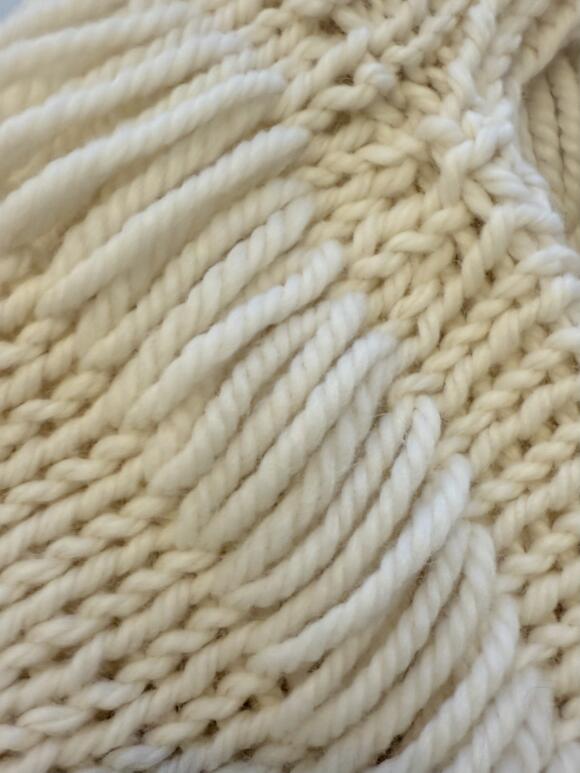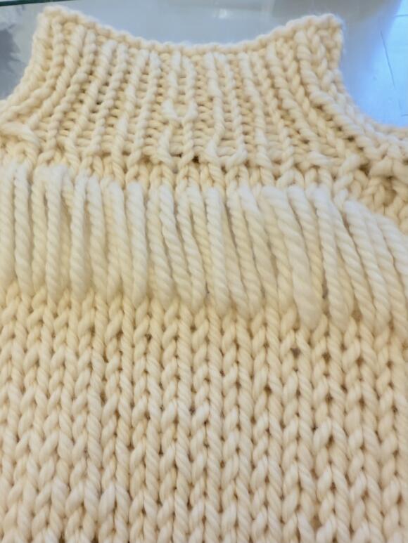 Chunky soft strik med vidde i ærmer - drop needle detalje rundt , øverst på strikken .