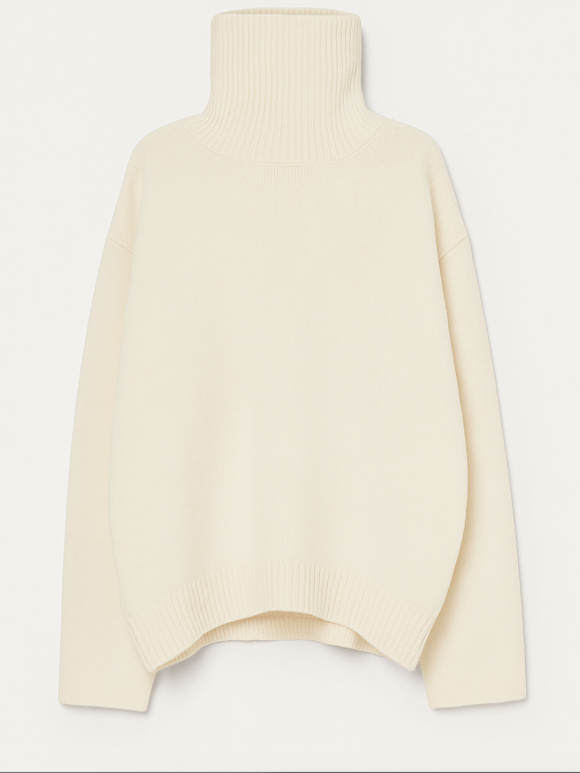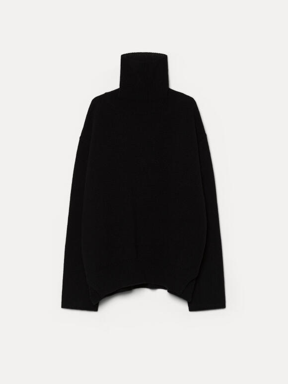 Casual style and precious materials come together in the high-neck sweater made of felted merino wool. The informal look of the felted wool enhances the relaxed attitude, with dropped shoulders, slightly voluminous sleeves, and wide side slits at the hem.