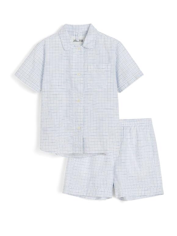 todelt pyjamassæt — overdel og underdel — fra AIAYU. • Farven er “Mix Blue Bell", som er en sart blå nuance med et diskret “check" (ternet) mønster. • Materialet er 100 % økologisk bomuld, certificeret via GOTS og fra Chetna-programmet i Indien