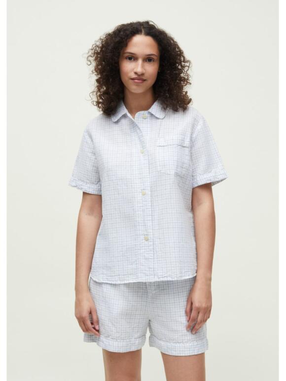 Design¬detaljer inkluderer: en skjorte-overdel med klassisk krave, knappelukning og brystlomme; shorts eller underdel med elastik i taljen . • Stoffet har lidt struktur som tilføjer charme og tekstur. • Plejeanvisning: