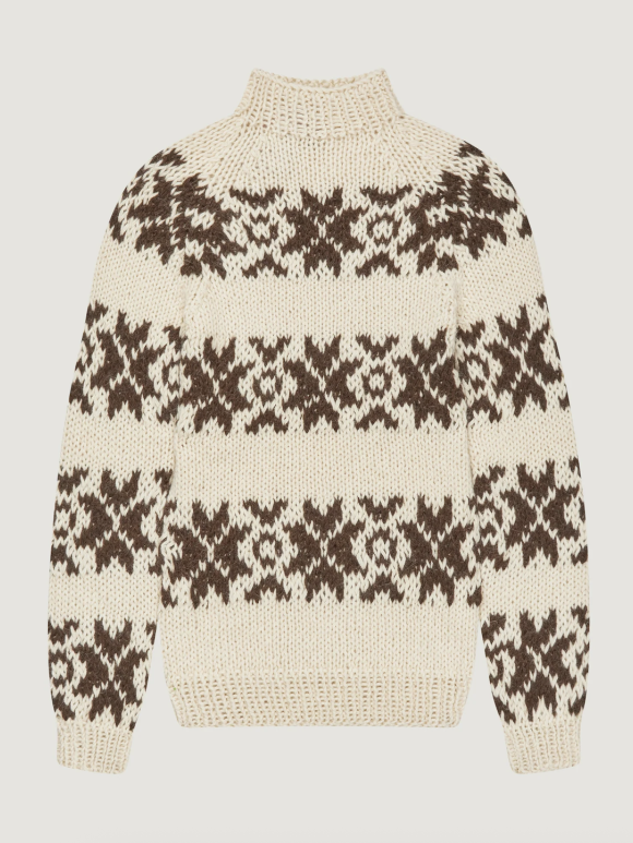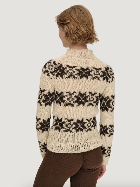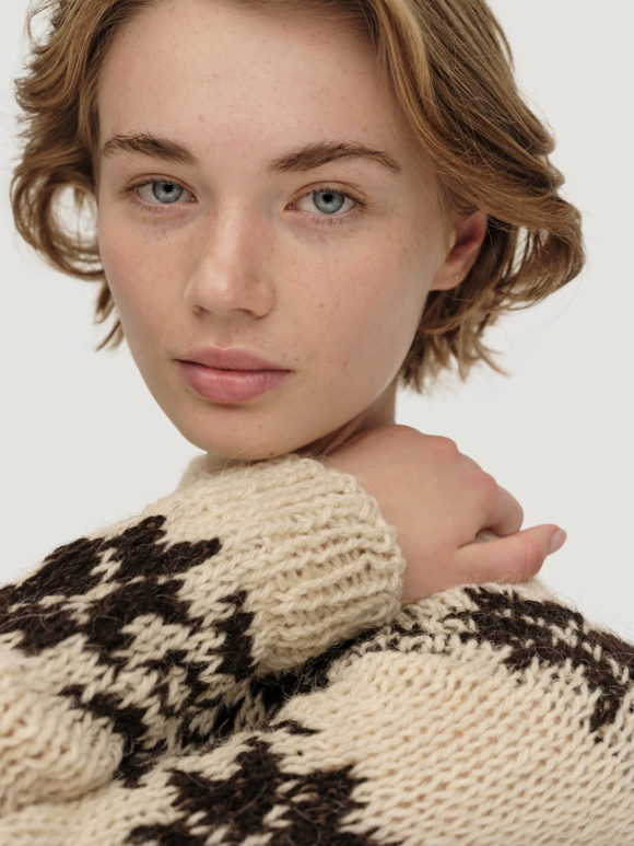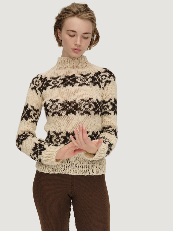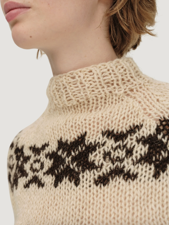 iconic Vón sweater, now reimagined in luxuriously soft alpaca for an even gentler feel. Featuring a high neckline and available in light-on-dark or dark-on-light, each colorway uses undyed yarns, celebrating the natural beauty and unique tones of the fibers.